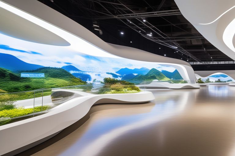 前廳:前廳的建筑造型采用了箭竹的形態(tài),利用竹子的彎曲和交錯(cuò),形成一個(gè)開(kāi)放而有序的空間,象征著自然和諧。前廳的展示方式主要是播放展廳的簡(jiǎn)介視頻,介紹展廳的主題、內(nèi)容、亮點(diǎn)等信息,同時(shí)設(shè)置接待臺(tái)、導(dǎo)覽圖、宣傳冊(cè)等設(shè)施,引導(dǎo)參觀(guān)者進(jìn)入展廳。前廳的展示內(nèi)容主要是展廳的概況,包括展廳的名稱(chēng)、位置、面積、功能、設(shè)計(jì)理念等,以及地理位置、區(qū)域劃分、主要特色等。前廳的設(shè)計(jì)意圖是為了給參觀(guān)者一個(gè)清晰而吸引的展廳概覽,同時(shí)讓參觀(guān)者有一個(gè)基本的認(rèn)識(shí),激發(fā)參觀(guān)者的興趣和期待。前廳的展示方式的選擇是為了利用大屏幕的視覺(jué)效果,傳遞展廳的主題和信息,同時(shí)提供一些便利的服務(wù)和設(shè)施,方便參觀(guān)者的導(dǎo)覽和咨詢(xún)。前廳的展示內(nèi)容的目的和作用是為了讓參觀(guān)者了解展廳的背景和目標(biāo),同時(shí)為參觀(guān)者提供一個(gè)參觀(guān)的框架和路線(xiàn),幫助參觀(guān)者更好地體驗(yàn)展廳。