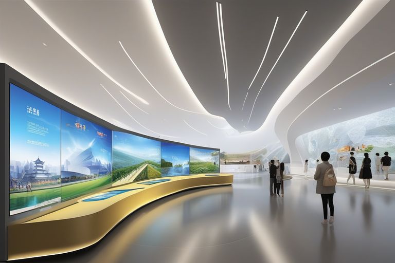 文化序廳:展示方式為一個環(huán)形的大屏幕,展示內容為一個由多個場景組成的動畫短片,每個場景展示本市的一個基本信息,如地理位置、行政區(qū)劃、人口分布、歷史沿革、經濟發(fā)展等,通過動態(tài)的畫面和聲光效果,給參觀者一個生動的本市概貌。同時,展廳的入口處設有一個互動查詢終端,參觀者可以通過觸摸屏查詢本市文化館的歷史沿革、主要功能、展廳布局等信息,為參觀者提供一個導覽的入口。本區(qū)域的設計意圖是為參觀者提供一個全面的本市概貌,同時也為參觀者提供一個導覽的入口,引導參觀者進入展廳的主題內容。展示方式的選擇是為了利用大屏幕的視覺沖擊力,吸引參觀者的注意力,同時也為了利用動畫的表現(xiàn)力,展示本市的多樣性和動態(tài)性?;硬樵兘K端的應用是為了利用數(shù)字技術的便捷性,提供參觀者的自主選擇,同時也為了利用數(shù)字技術的更新性,保證展示內容的時效性。