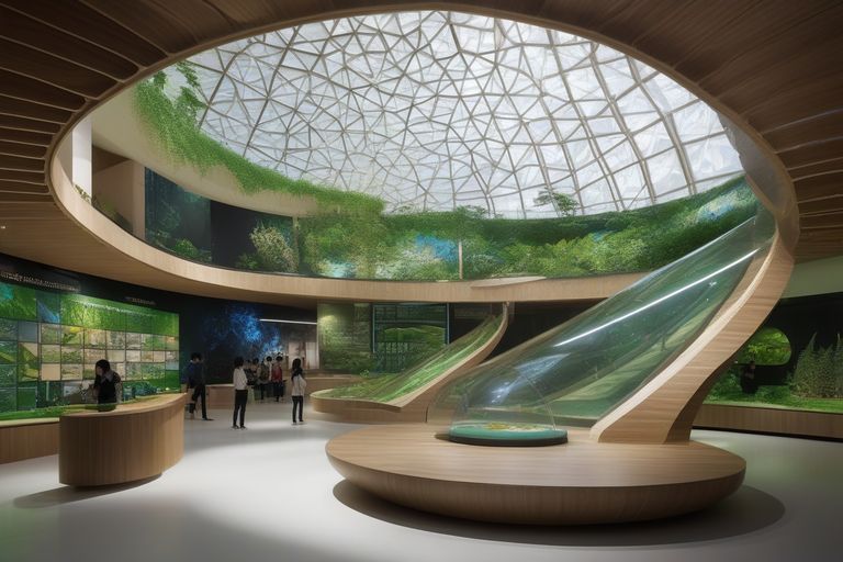 生命的未來:該區(qū)域的建筑造型為一個(gè)半圓形的拱門,象征著杏花村的生物多樣性保護(hù)和發(fā)展項(xiàng)目的希望和未來。展示方式為成果展示和體驗(yàn)展示相結(jié)合,展示內(nèi)容為杏花村的生物多樣性保護(hù)和發(fā)展項(xiàng)目的目標(biāo)、內(nèi)容、措施、成果和展望。該區(qū)域的設(shè)計(jì)意圖是讓參觀者感受到杏花村的生物多樣性的價(jià)值和潛力,展示方式的選擇是為了增強(qiáng)參觀者的認(rèn)可和贊賞,多媒體設(shè)備的應(yīng)用是為了增加參觀者的參與和支持,展示內(nèi)容的目的和作用是為了提高參觀者的生態(tài)行動(dòng)和貢獻(xiàn)。該區(qū)域包含以下的展示形式和內(nèi)容:
